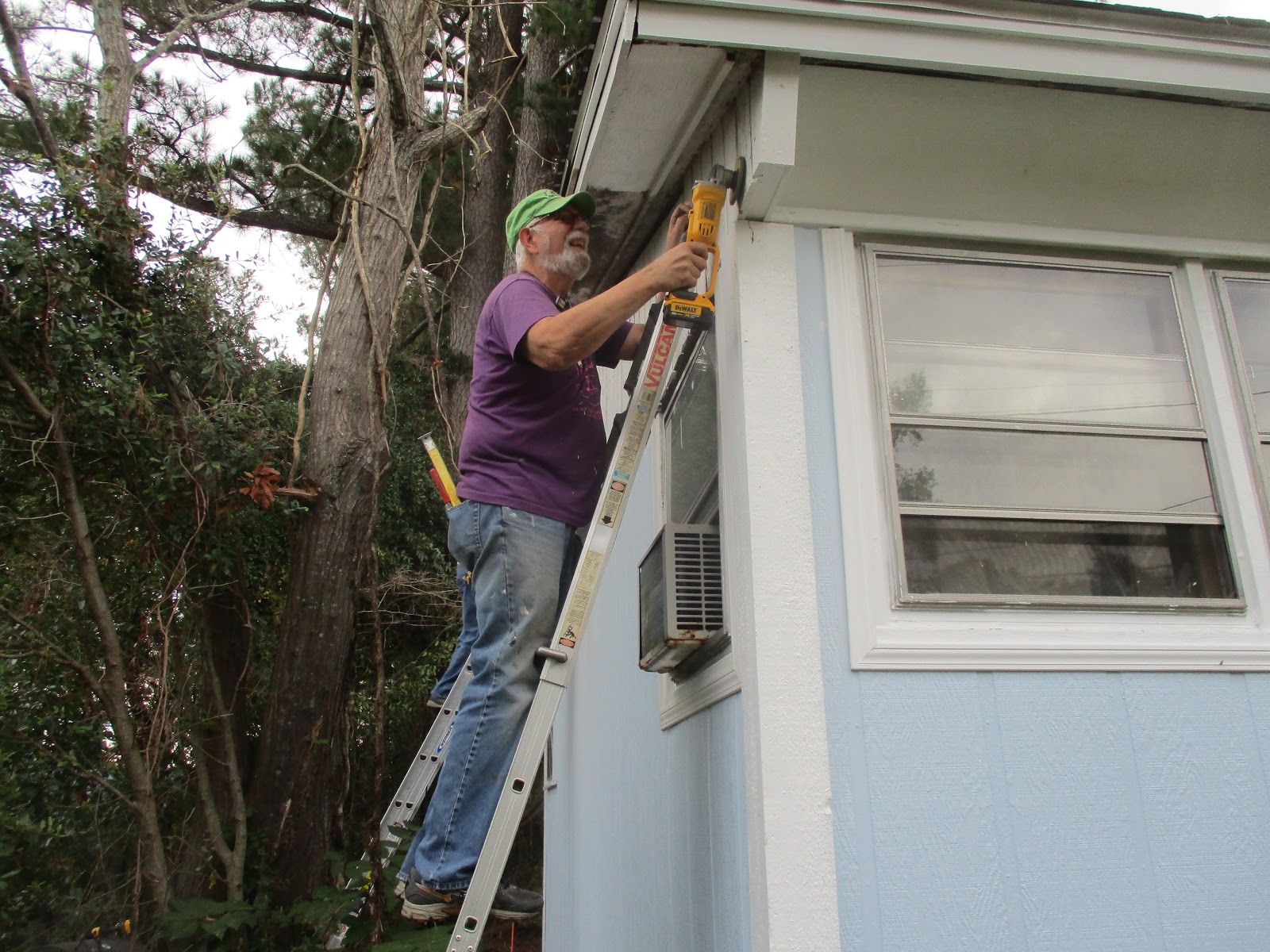 | with the screened area mostly complete, Stel helps Dennis install new siding |